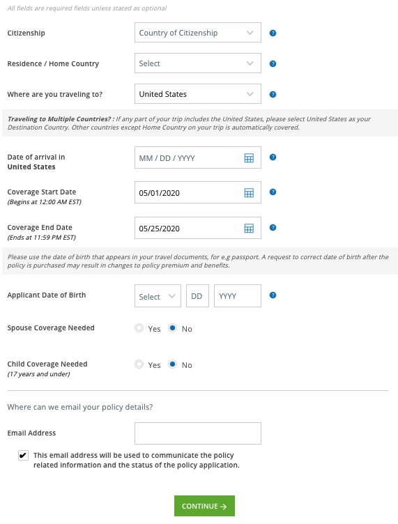 首先根据保险公司的要求填写个人信息和旅行信息(见下图)。然后点击 CONTINUE 键。
