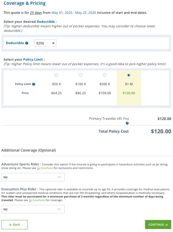 然后在 Coverage & Pricing 这里根据自己的需要选择 Deductible 个人自付额和保险总额(Policy Limit)。根据您的选择保险费会自动更新。(见下图)确定后点击 CONTINUE 键。