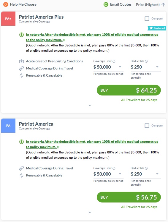 您可以选择 Patriot America,Patriot America Plus, 或 Patriot Platinum 系列的保险计划。例如本例中申请Patriot America Plus 计划的保险费总额为 $64.25 美元。